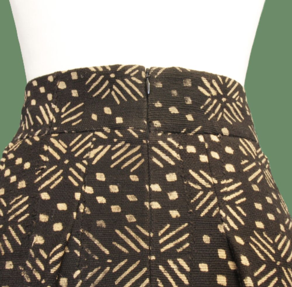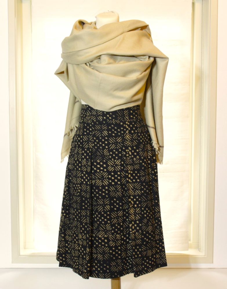 De rok heeft de specifieke kenmerken van een exclusief kledingstuk; van de fraaie afwerking van de zoom en tailleband, tot de ruim vallende plooien aan de voor- en achterzijde.